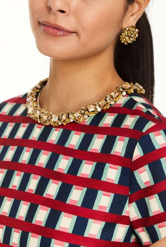 - Classic shift silhouette with beaded embroidery around neckline