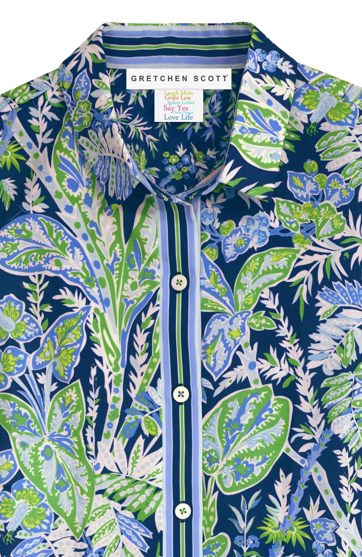 Easy, elevated, and effortlessly chic—the Gretchen Scott Boyfriend Shirt in Vintage Vines Print (Navy) blends menswear-inspired tailoring with signature feminine flair. Cut to a flattering 20" length with a men’s shirt hem, this relaxed silhouette is perfect for layering or wearing solo.