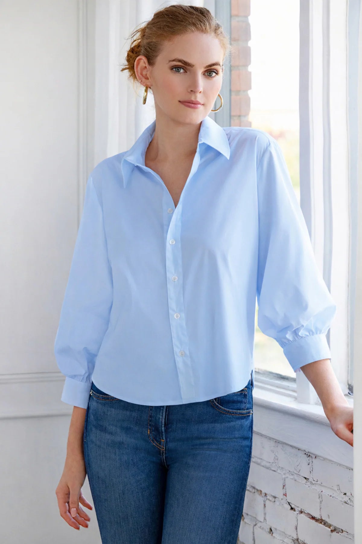 - Finley "Cora" Button down shirt in blue silky poplin fabric