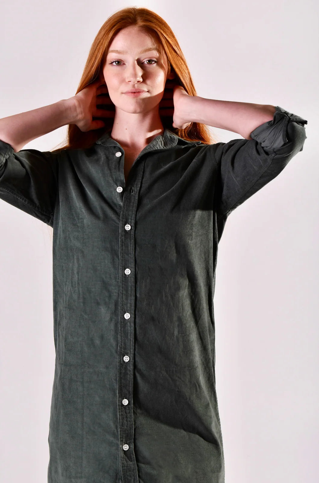 Meet your new go-to for effortless style and comfort — the Baby Cord Girlfriend Midi Dress from Emily Phillips. Crafted from lightweight black baby cord fabric in a rich forest green hue, this dress brings a relaxed yet refined feel to your wardrobe. With its soft 100% cotton construction and easy button-front design, it’s perfect for layering or wearing solo.