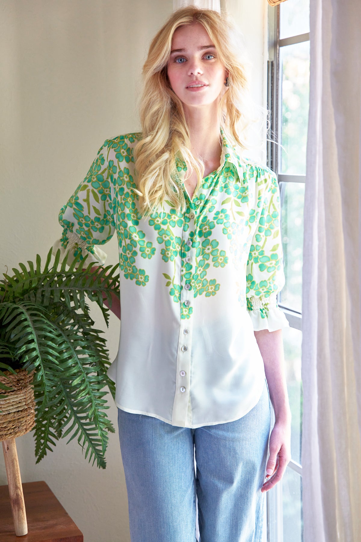 The Sirena Blouse in Clover Print by Finley is an easy, feminine staple with just the right amount of detail. Designed with a classic button-front and spread collar, this relaxed silhouette features soft shirring along the shoulder seam and elbow-length puffed sleeves finished with smocked cuffs for a flattering shape. Crafted from a lightweight viscose-polyamide blend, it drapes beautifully and feels effortless all day. Finished with a shirttail hem, this versatile blouse pairs seamlessly with denim, trousers, or skirts for polished everyday wear.