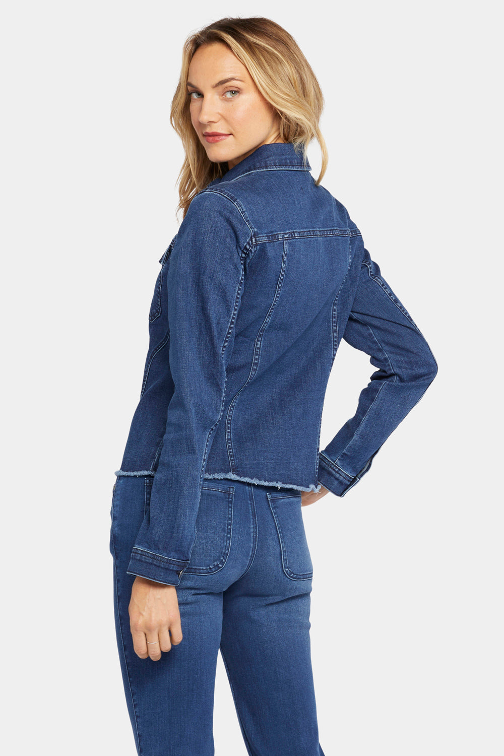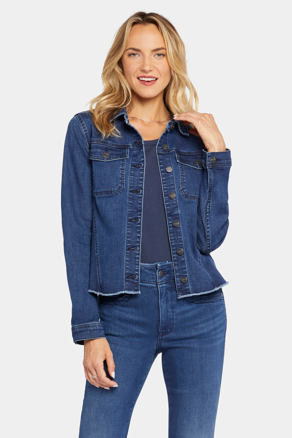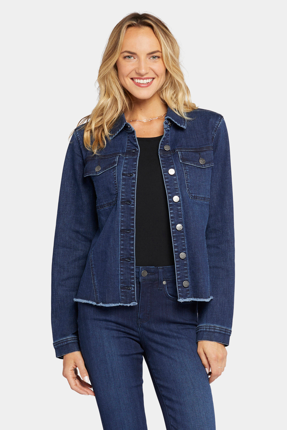 NYDJ's Frayed Hem Jacket in Stretch Twill is the perfect layering piece on balmy days. Slanted front seams give it a tailored look, while a point collar and long sleeves with rolled cuffs offer classic shirting detail. It has two patch pockets with ample room for your essentials. Finished with front button closures and a frayed hem. This jacket is made with earth-friendly methods that result in reduced consumption of water, chemicals and/or energy. Front button closure; front patch pockets