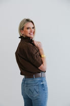 Chic, timeless, and game day ready — the Ruffle Top in Purple or Chocolate by Heidi Houston is your go-to style staple for effortless confidence and standout flair. Made from 100% cotton, this fan-favorite features a playful ruffle collar, short sleeves, and a flattering oversized fit that combines comfort with elevated design.