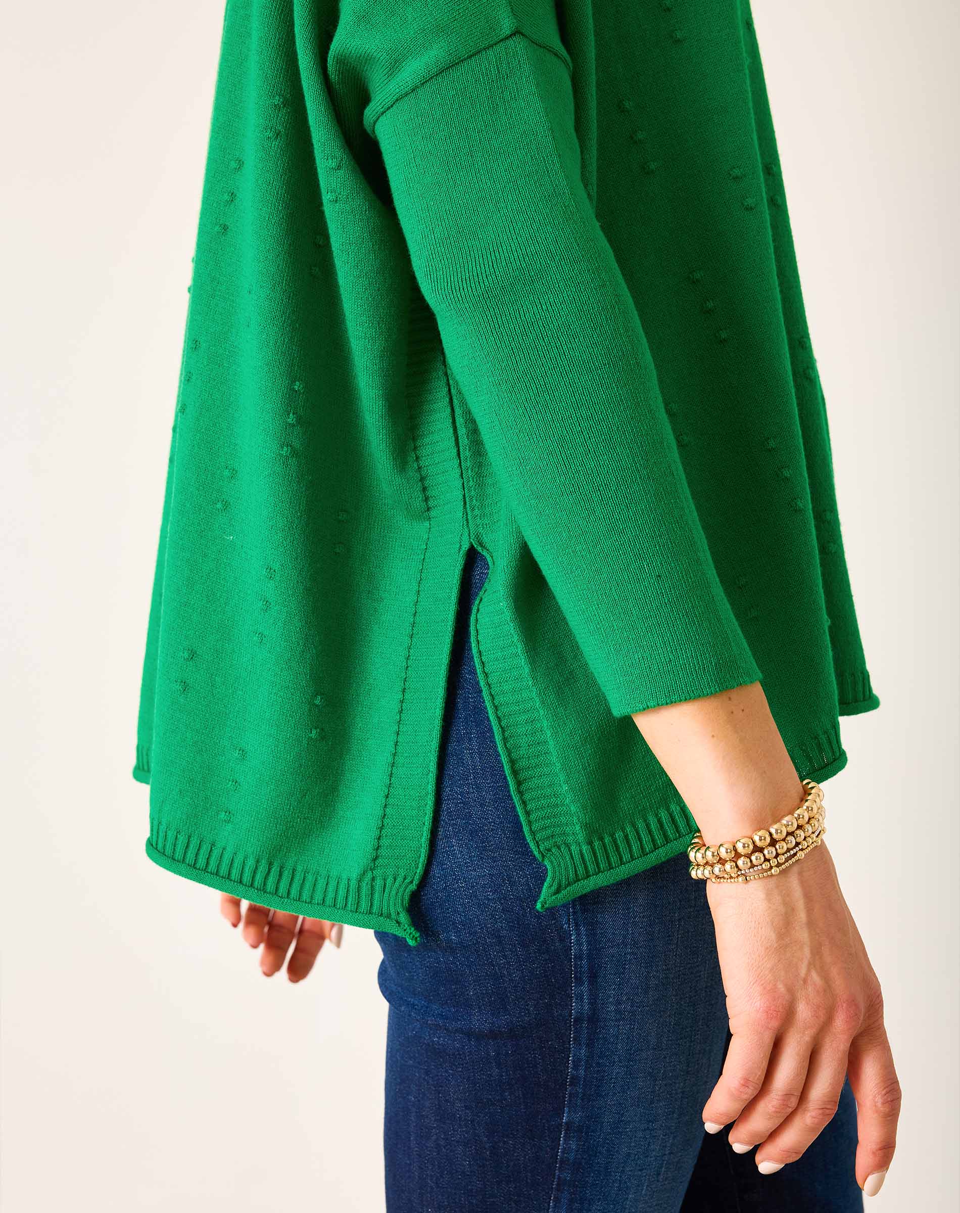 - MERSEA signature side slits (6 ½") for movement and layering ease
