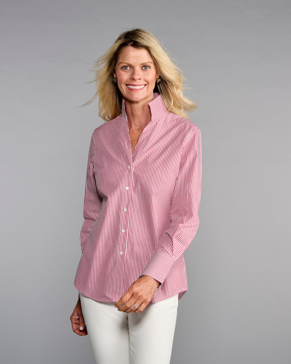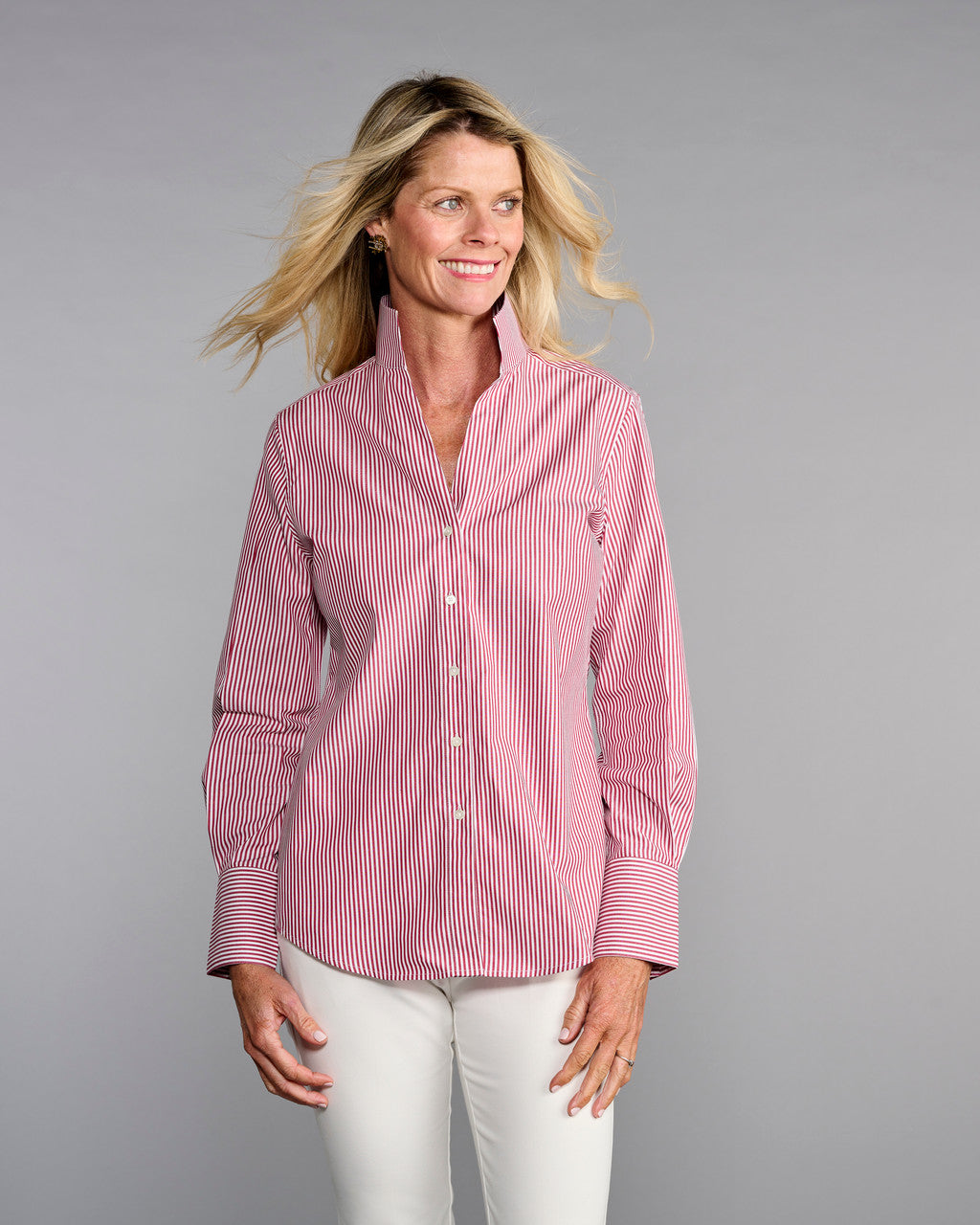Introducing The League—a tailored, modern take on a classic menswear shirt, now available in a rich Bordeaux Stripe. Crafted in crisp, 100% cotton, this fitted-style shirt is designed to flatter the feminine form while channeling a subtly structured, androgynous edge.