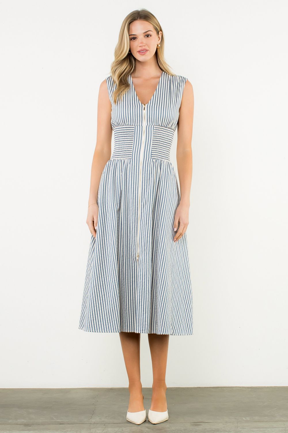 Fresh, feminine, and effortlessly flattering—the Sleeveless Striped Maxi Dress from THML is a standout summer essential. Featuring a timeless blue and white vertical stripe pattern, this dress combines classic design with modern tailoring for a look that’s polished yet breathable.