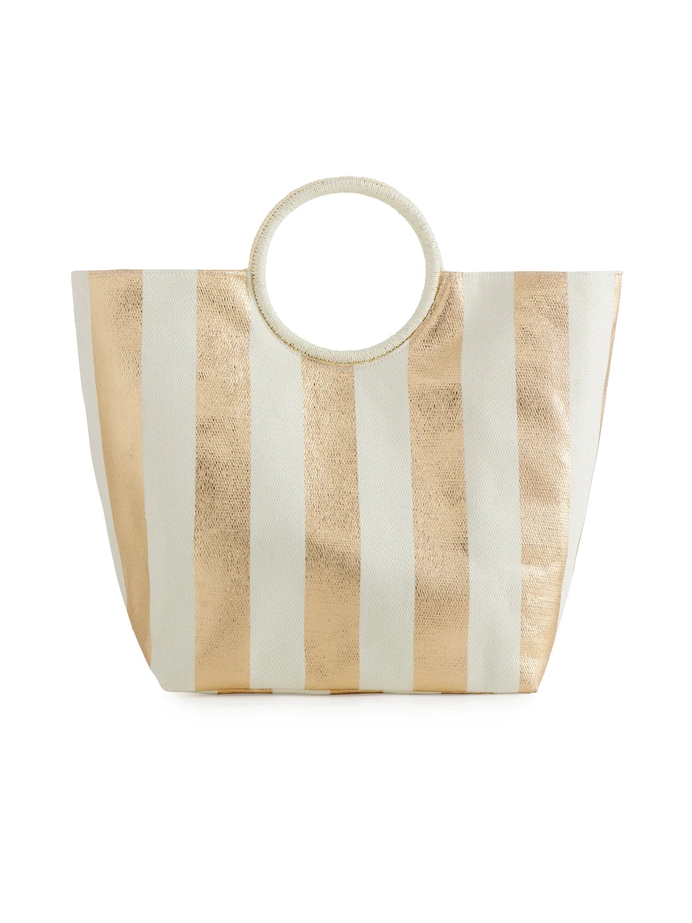 Features: Bold stripe color blocking, circular handle, roomy interior