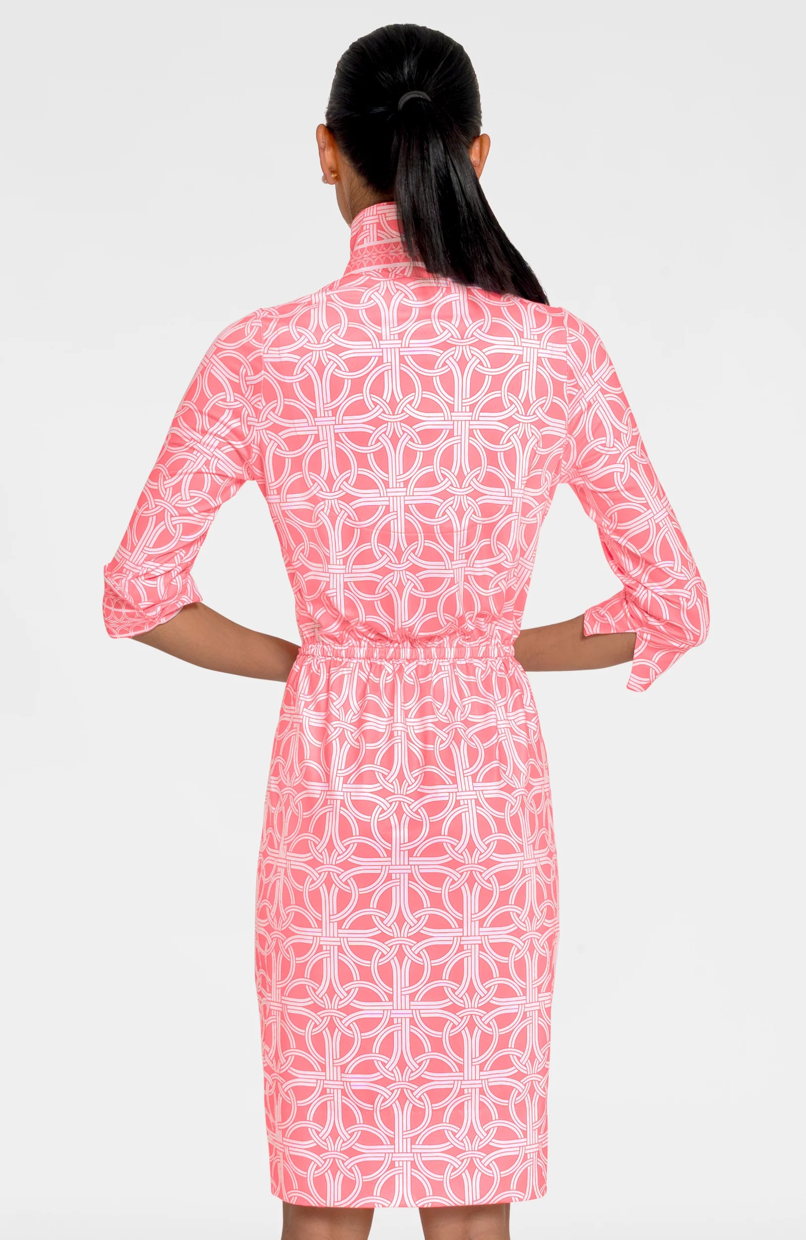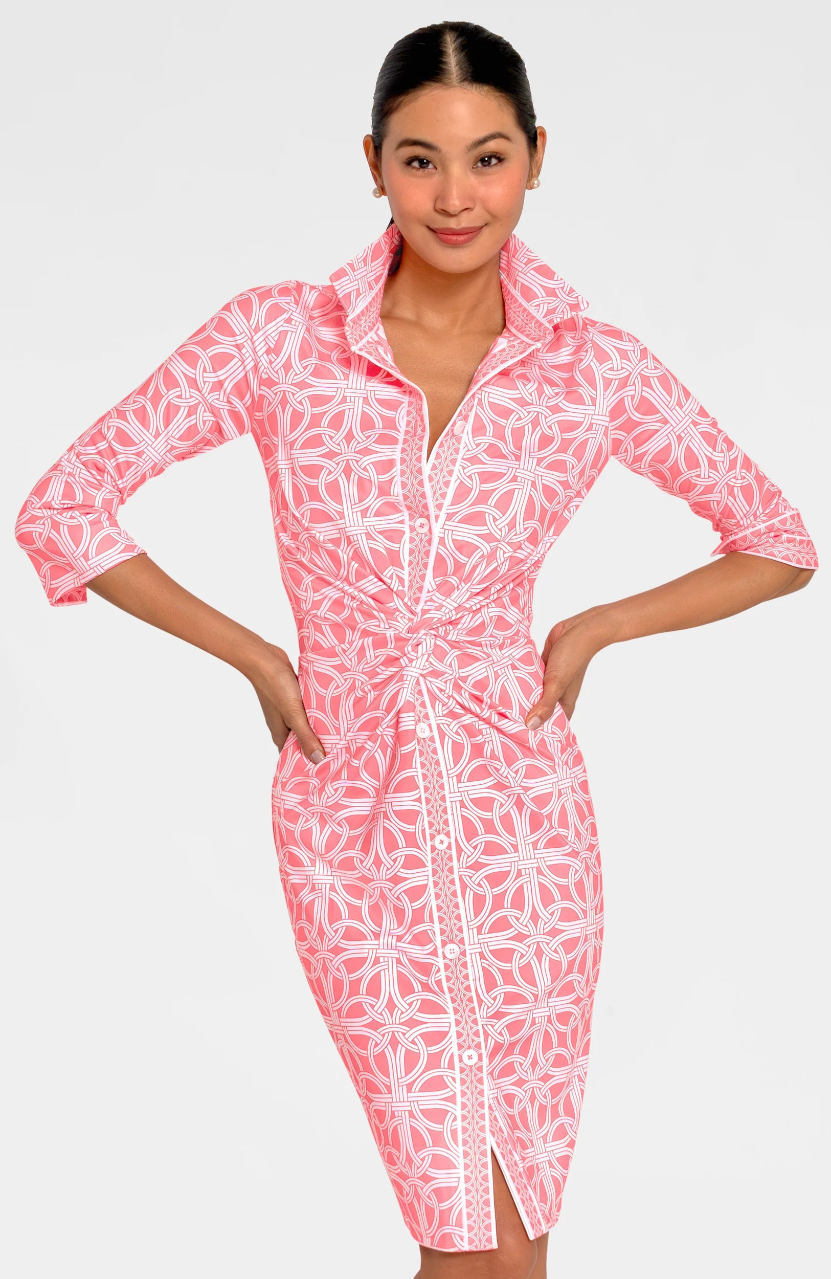 The Gretchen Scott Twist & Shout Dress is a chic and modern take on a classic style. With a flattering 36" length and 3/4 sleeves, this dress offers both elegance and comfort. The optional coordinating turn-back cuffs add versatility to the sleeve design. Featuring a 4" hand hem, the dress showcases a bold 2" racer stripe banding along the center front, inside collar, and cuffs, bringing a sporty yet stylish edge. Shiny brass buttons provide a touch of sophistication, while the coordinating fabric on the inside back panel adds a unique detail. This dress combines contemporary flair with practical features, making it an excellent choice for both casual and dressed-up occasions.